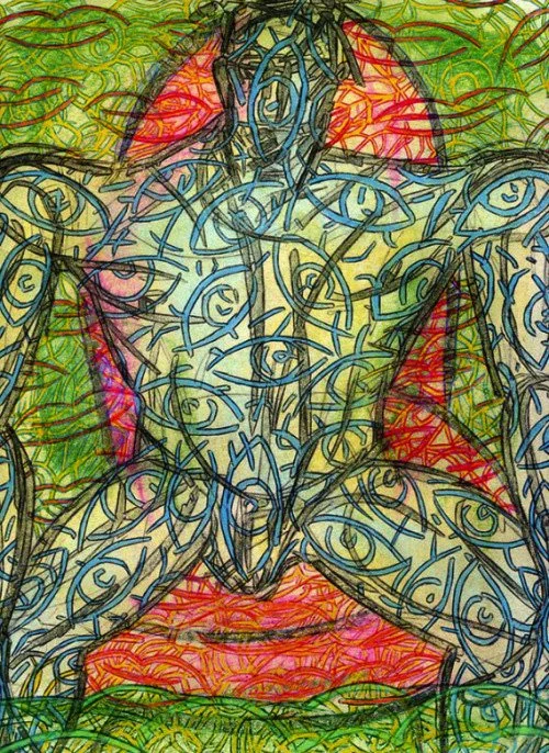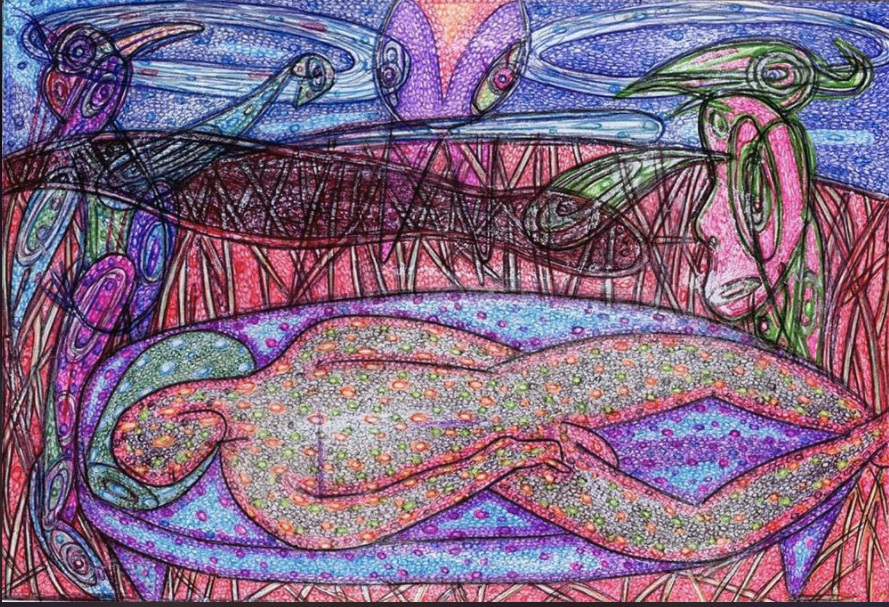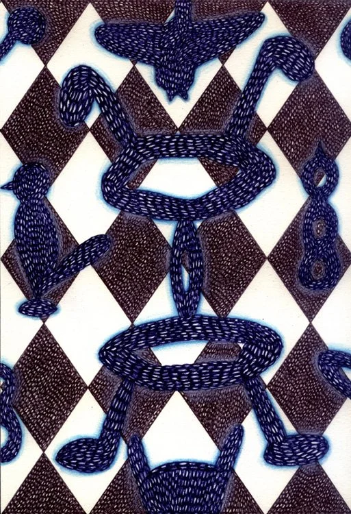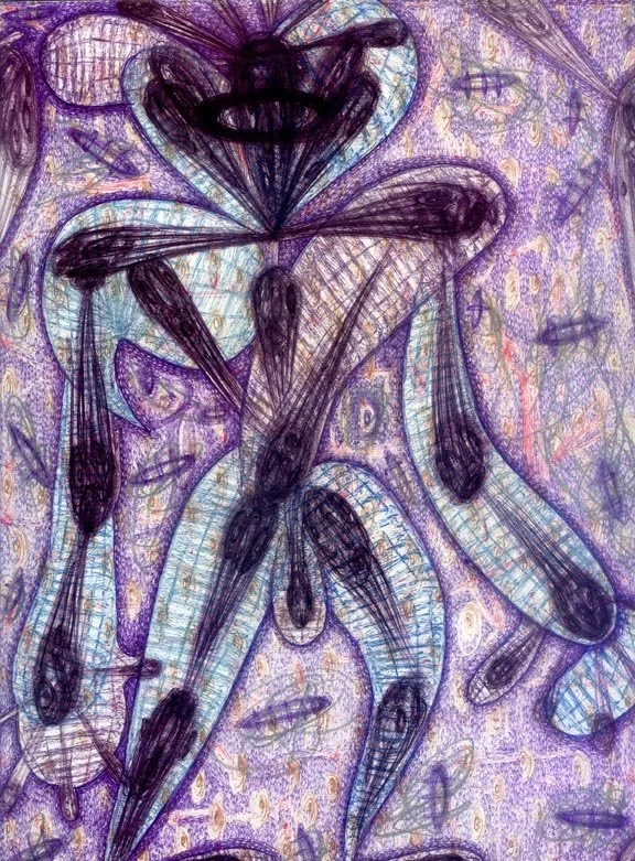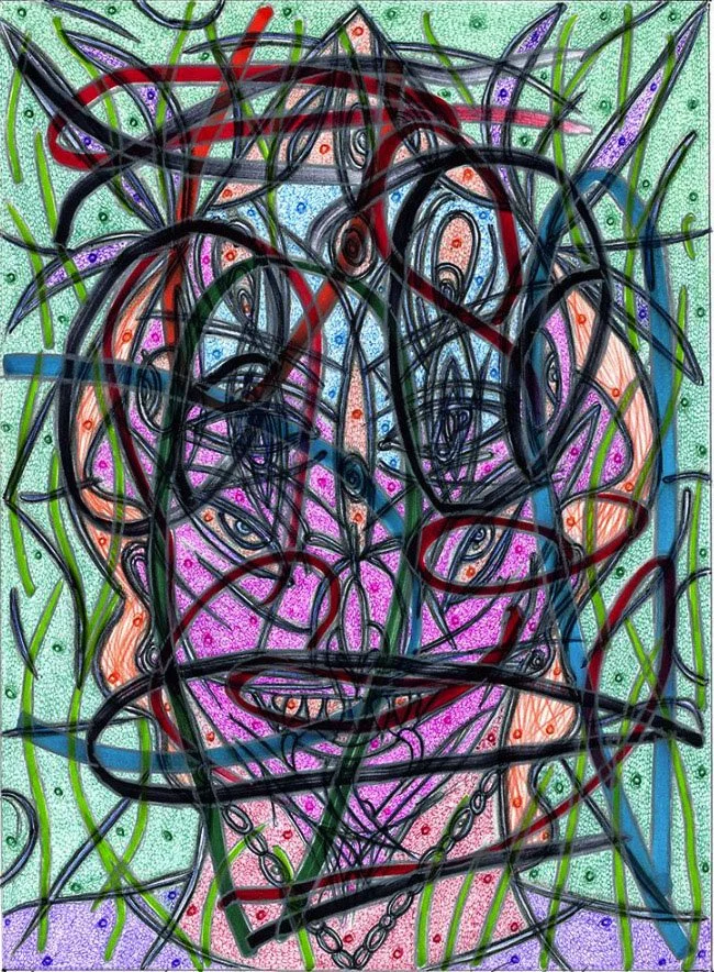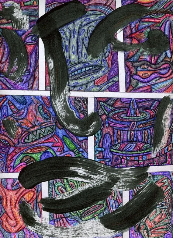 "Bardo Fade Loop Nod" by Will Northerner, 14.5" x 11.5", Illustrator ballpoint, Acrylic, Pastel and Oil crayon on Strathmore Bristol paper, FS