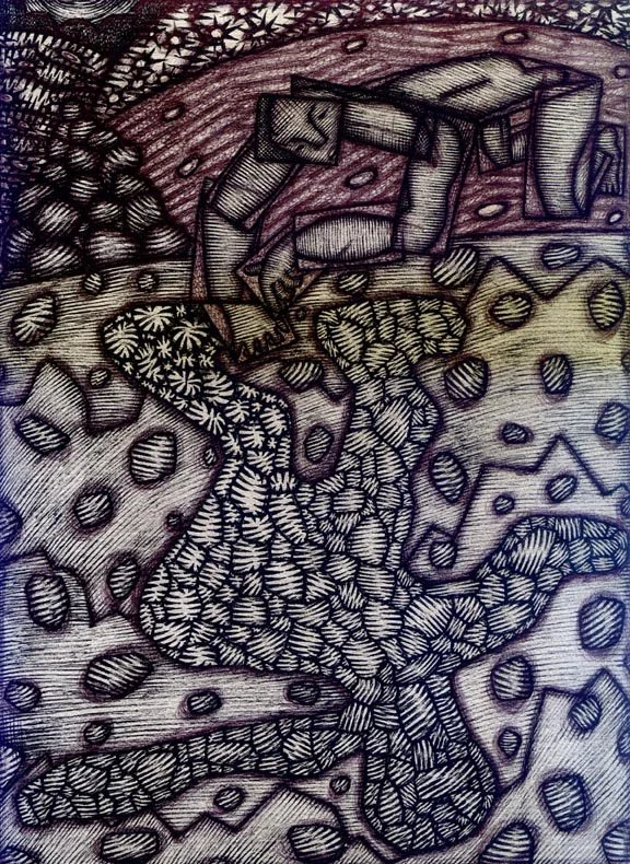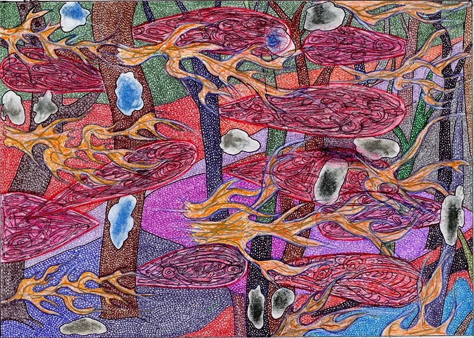 "THE END OF EACH FORK 2", 11.5" X 14.5", ILLUSTRATOR BALL POINT, OIL PASTEL, PASTEL, FELT TIPS, ON STRATHMORE BRISTOL, WILL NORTHERNER ART, 7-11-24 - FS