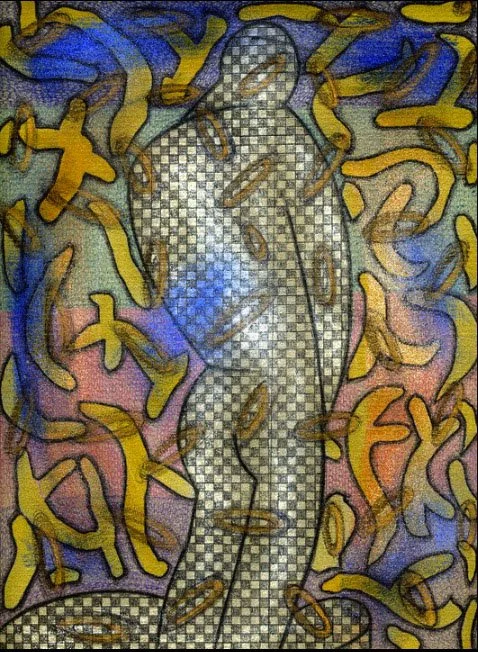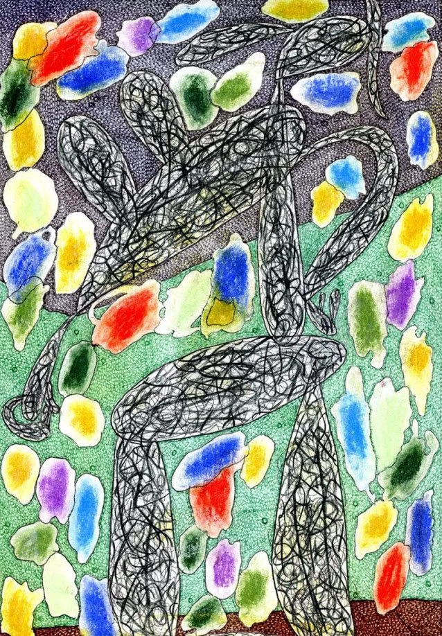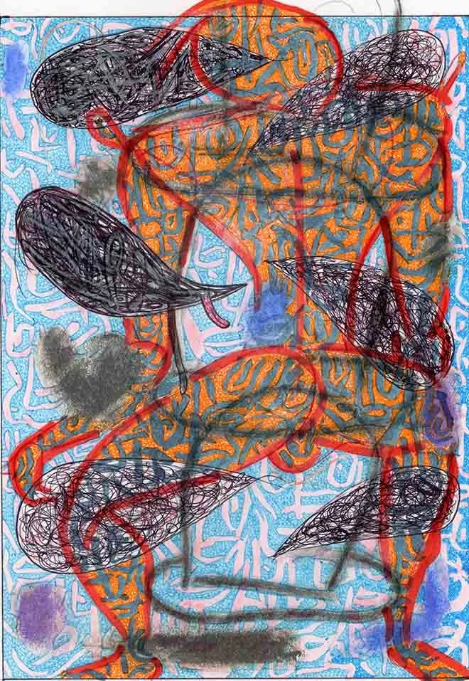 "TONIC WALKABOUT 25", WILL NORTHERNER ART, 11.5" X 14.5", ILLUSTRATOR BALL POINT, PASTEL, OIL PASTEL, WATERCOLOR AND FELT MARKER ON ARCHES PAPER. 4-13-24. FS